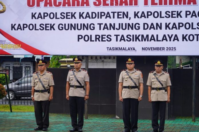 POLRES KOTA TASIKMALAYA — Kapolres Tasikmalaya Kota AKBP Moh Faruk Rozi, S.H., S.I.K., M.Si. memimpin Upacara Serah Terima Jabatan (Sertijab) empat Kapolsek jajaran Polres Tasikmalaya Kota, bertempat di Lapangan Upacara Mapolres Tasikmalaya Kota pada Jumat (28/11/2025) pukul 07.00 WIB.