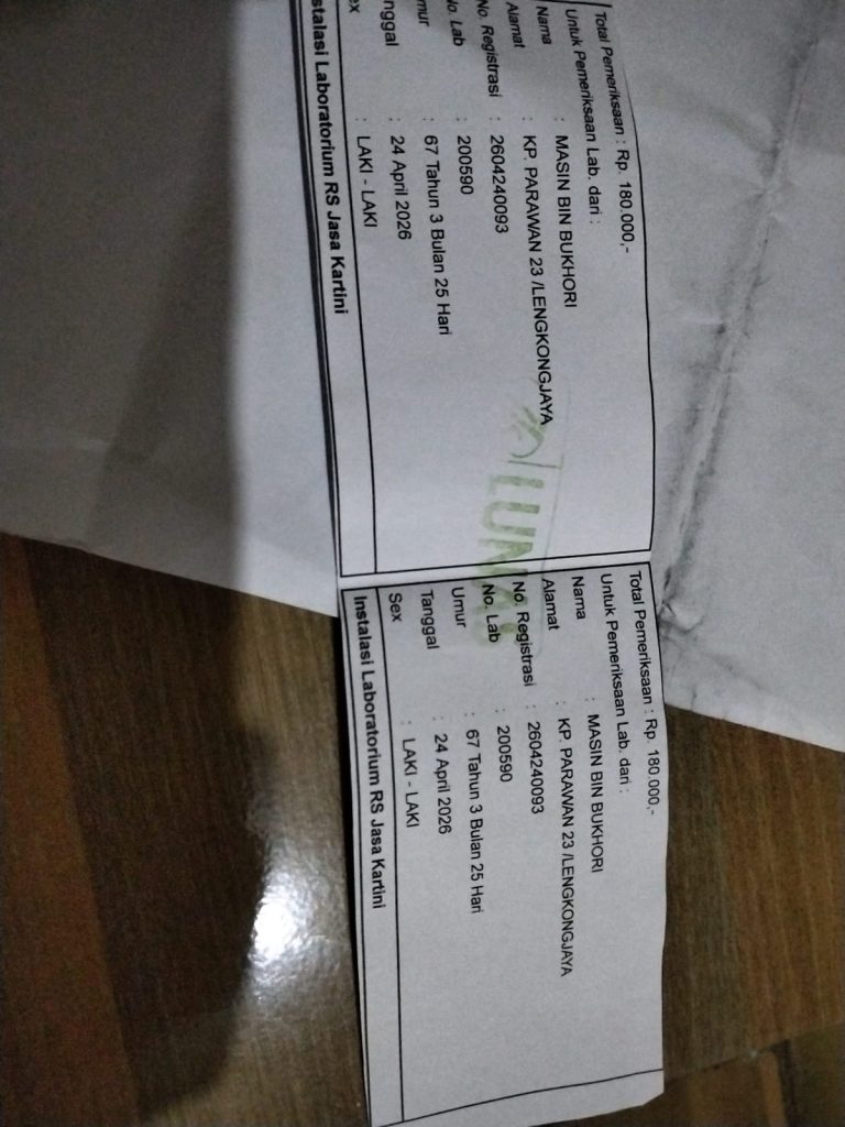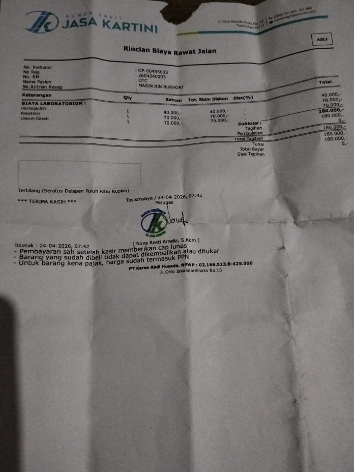 Lintaspasundannews​TASIKMALAYA.JABAR – Kekecewaan mendalam dirasakan oleh keluarga pasien di Rumah Sakit Jasa Kartini, Tasikmalaya. Pasien berinisial M (67), yang terdaftar sebagai peserta BPJS Kesehatan, dikabarkan tetap harus mengeluarkan biaya pribadi untuk pemeriksaan laboratorium, sebuah hal yang dianggap memberatkan pihak keluarga.