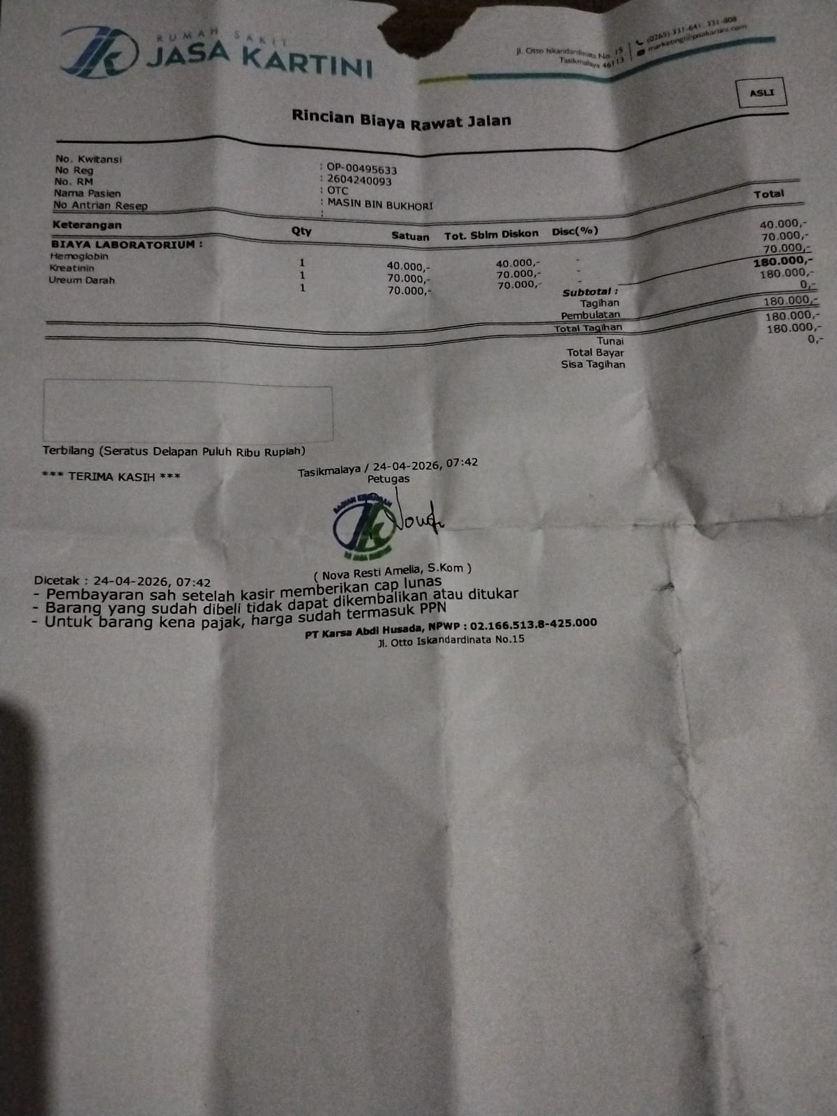 ​Berdasarkan bukti kuitansi yang beredar tertanggal 24 April 2026, pasien diminta membayar biaya sebesar Rp. 180.000,- untuk rincian pemeriksaan kesehatan